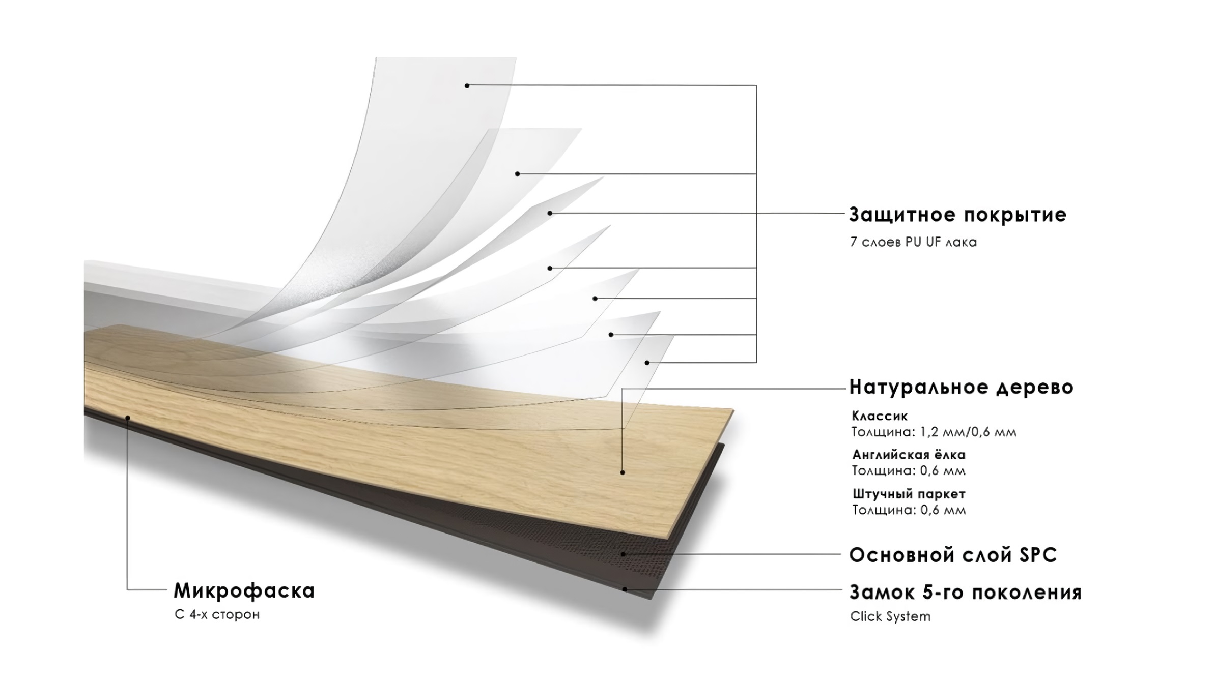 В его основе — SPC-плита (каменно-полимерная плита), обладающая сверхпрочностью и стабильностью камня. А сверху — настоящий срез дерева - строганый шпон дуба, ореха, тика, венге, гикори, африканской дуссии и других ценных пород. Слой грунтовки и 7 слоев лака с корундом защищают древесину от воздействия воды, ультрафиолета и ударов.