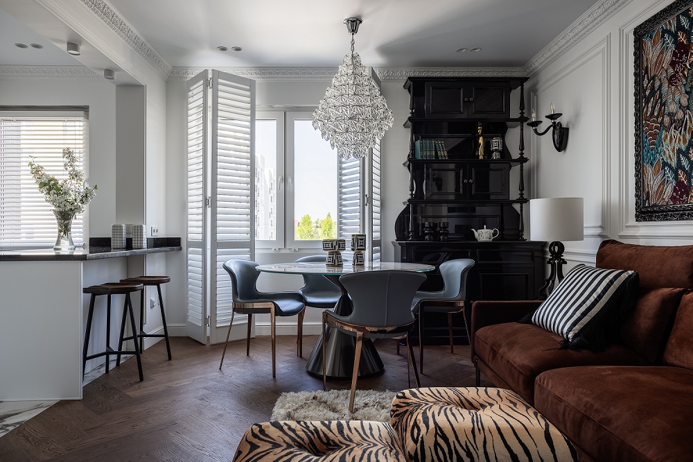 - интерьеры с молдингами, высокими плинтусами, декоративными элементами.