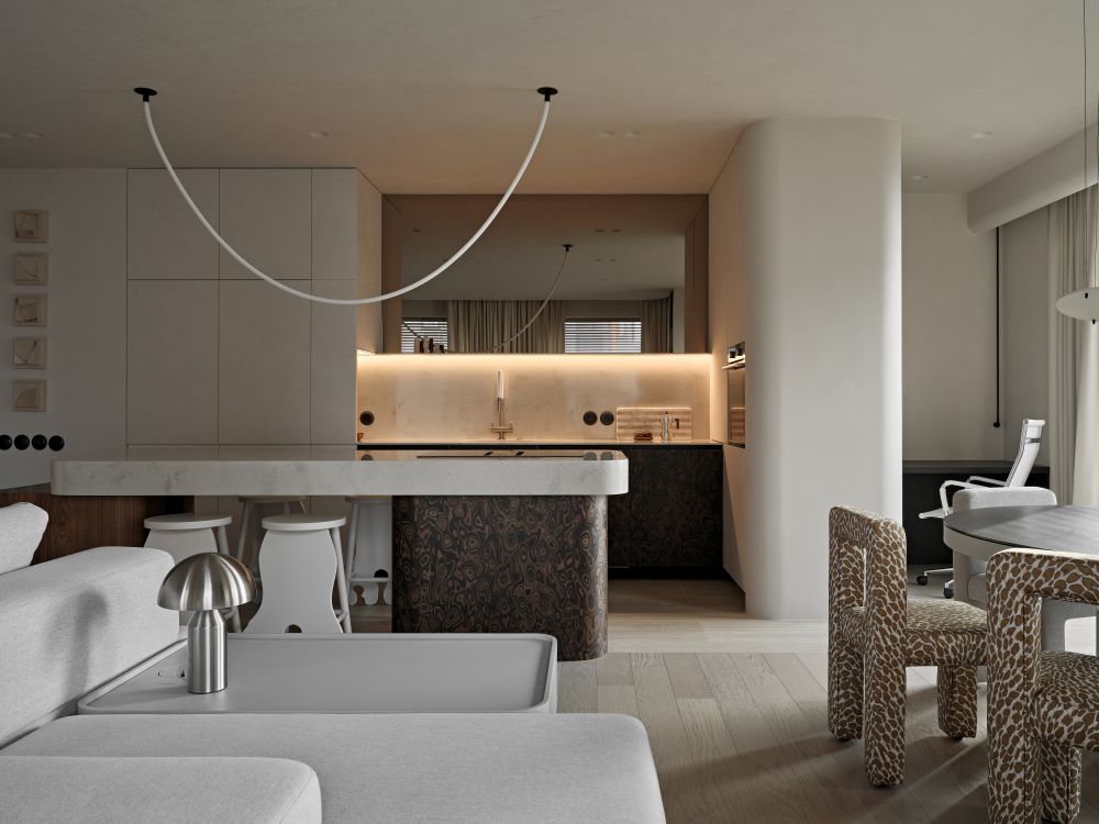 Основная задача — сохранить планировку, но полностью изменить ощущение пространства с помощью мягкой геометрии, продуманного света и правильных материалов.